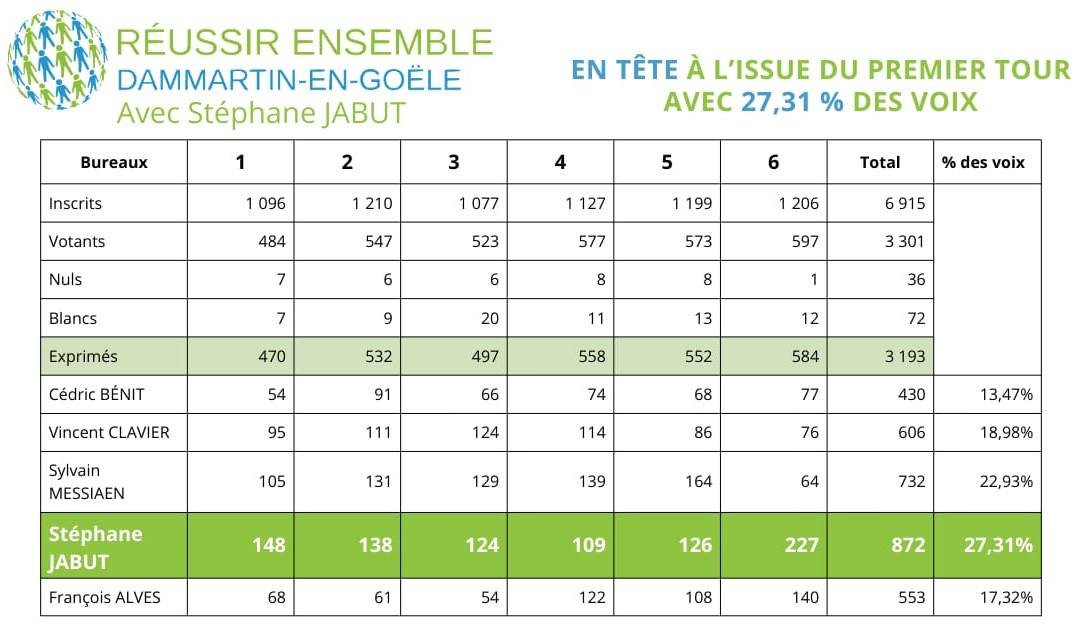 Nous vous appelons à renouveler le choix fait majoritairement par les Dammartinoises et les Dammartinois et à voter pour notre liste Réussir ensemble Dammartin-en-Goële, liste citoyenne d'intérêt général.